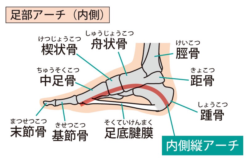 スポーツ活動が最も多い原因とされていますが、加齢による筋力の低下や筋肉、腱の柔らかさの低下も足底腱膜炎になりやすい原因とされています。特にアキレス腱(けん)の周辺が硬くなってしまうとつま先を下に向ける動きに制限がかかり、足底腱膜に負担がかかりやすいです。またハイヒールなどの高い靴を日頃履いている方や、ハイアーチと呼ばれる土踏まずが高い位置にある方などは足の裏の筋肉や足底腱膜に常に力が入っている状態となり、足底腱膜炎になりやすいとされています。