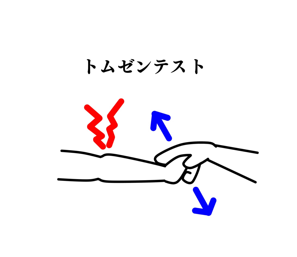 手首を押さえながら手の甲側に反った時に痛みが誘発される手関節伸展テスト(トムゼンテスト)や、中指を押さえた状態で中指を反らすと痛みが誘発される中指伸展テストを行い痛みが出た場合テニス肘である場合が多いです。テニス肘の主な原因筋である短橈側手根伸筋は肘の外側から中指の骨に付着するので中指に抵抗をかけて動かしてもらうことで筋肉が引き伸ばされ痛みが誘発されます。