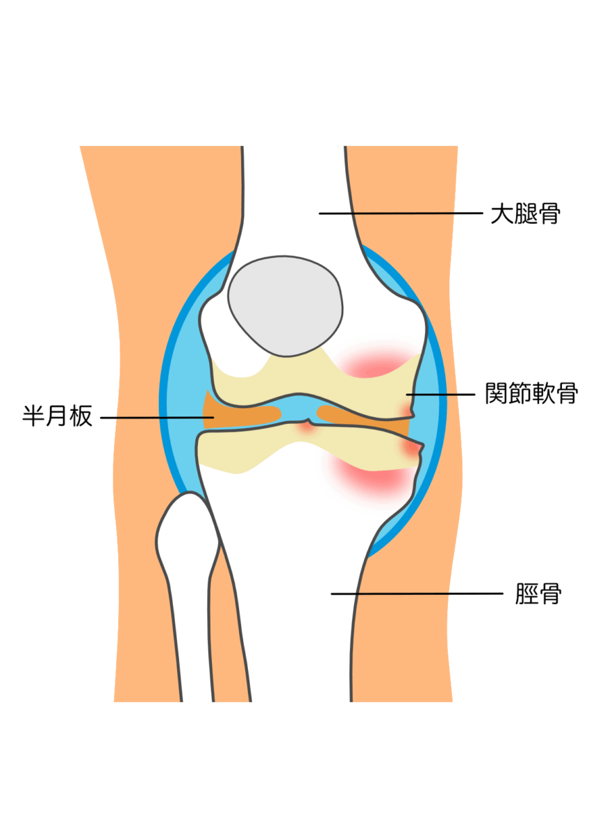 膝関節のクッションのような役割をする関節軟骨がすり減ると骨同士がぶつかったり摩擦が大きくなることで炎症が起き、痛みが出てきます。軟骨がすり減ることで骨を覆っている滑膜という膜から関節液が分泌され骨同士の摩擦を軽減しようとします。よく「膝に水が溜まっている」と言いますが、これは膝関節に関節液が過剰にある状態を指し、腫れや膝が固まって動かしづらいといった症状が出てきます。
